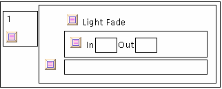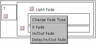 Lichtwechsel-Aktionen benutzen standardmäßig einen  Cross-Fade (oder auch  X-Fade) -- die momentane Lichtstimmung wird linear in die Lichtstimmung des neuen Cues überführt. (Das X im Event steht gerade für ,,X-Fade''.) Oft ist es wünschenswert, Ein- und Ausblendzeiten unabhängig voneinander anzugeben, oder sogar Verzögerungen für Ein- oder Ausblendung anzugeben. Lula erlaubt dies durch Wechsel des Blendzeit-Typs.